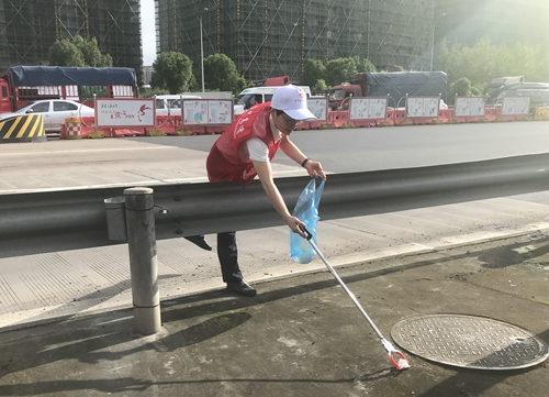 圖為工作人員向過往司乘發(fā)放垃圾不落地宣傳單