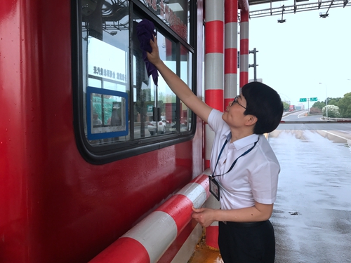 圖為工作人員打掃收費崗亭衛(wèi)生