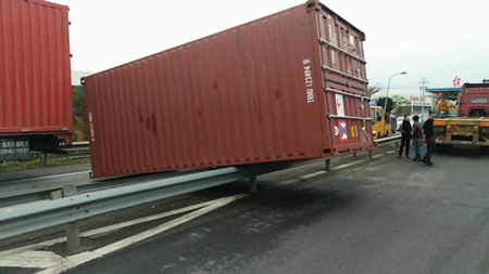 12月15日10:10分左右,一輛車牌為浙B88C06的集裝箱車在臺州南副站選擇出口車道時,因變道和出口運載汽車的長掛車發(fā)生碰撞,使得未鎖牢的集裝箱箱體甩落下來,砸到護欄及進口一輛正在通行的貨車車頭,造成護欄變形、貨車車頭受損嚴重,所幸無人員受傷。