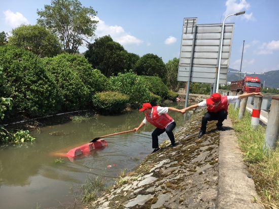 圖為志愿服務(wù)現(xiàn)場 隔離護(hù)欄被風(fēng)吹歪的,將其扶正,并作簡單的固定;綠化帶好多樹被連根拔起,找來撐桿、繩子進(jìn)行加固;斷枝殘葉滿地都是,就用手撿,用掃把掃,集中堆放倒伏的斷枝;清掃路上的垃圾;清除路障;打撈被風(fēng)吹入邊溝的水馬;對收費(fèi)區(qū)域的衛(wèi)生來了一次大清理…… 臺風(fēng)后氣溫升高,空氣濕度大,天氣異常悶熱,志愿者們揮汗如雨,一個(gè)個(gè)臉被曬得通紅,他們卻沒有因此放下手中的工具,停滯清理的步伐,迎“熱”而上,為災(zāi)后的恢復(fù)貢獻(xiàn)自己的力量,用行動踐行初心和使命。 夏蓮萍