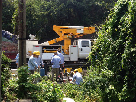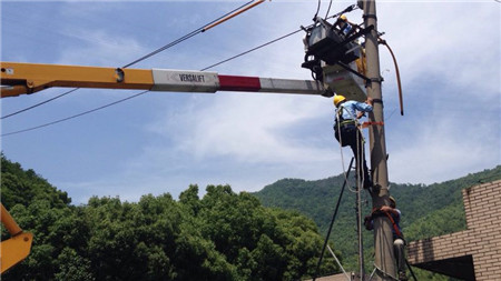 圖為執(zhí)勤人員配合供電部門(mén)安裝高壓線路