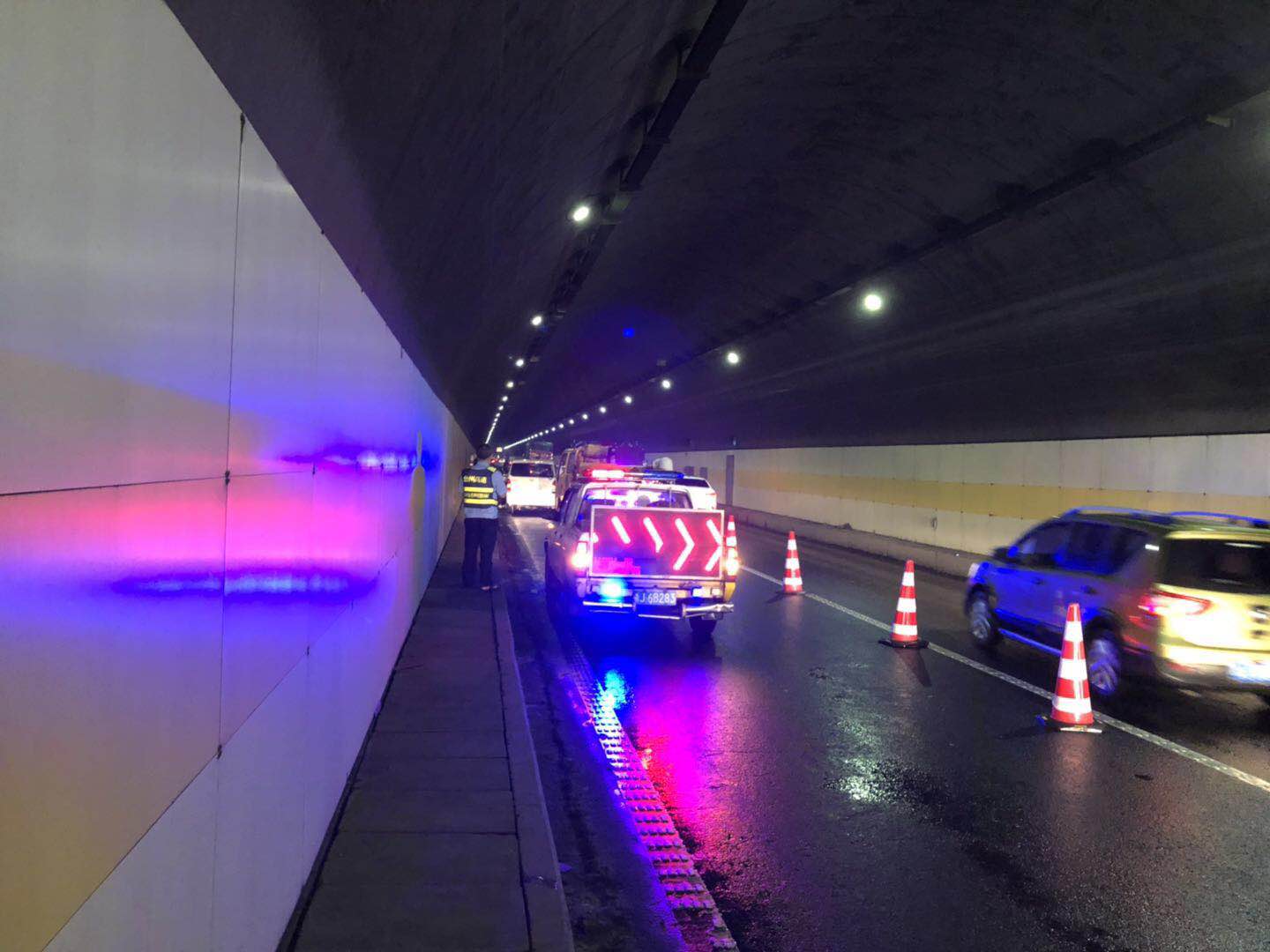 7月14日19時22分,中控員朱金飛發(fā)現(xiàn)黃土嶺寧向隧道1000米快車道處有車拋錨。立刻呼叫執(zhí)勤隊前往處置,隨即更改快車道交通信號。 執(zhí)勤隊迅速出警,幾分鐘后就趕赴事故現(xiàn)場,發(fā)現(xiàn)一輛白色面包車撞在隧道內(nèi)右側(cè),車輪箍嚴重受損,卡在護溝里,所幸無人員受傷。執(zhí)勤隊進行提前預警,預防二次事故的發(fā)生,并呼叫高速施救車輛支援,幾分鐘后施救車抵達,事故車輛安全拖離隧道,僅僅十分鐘,交通就恢復暢通。