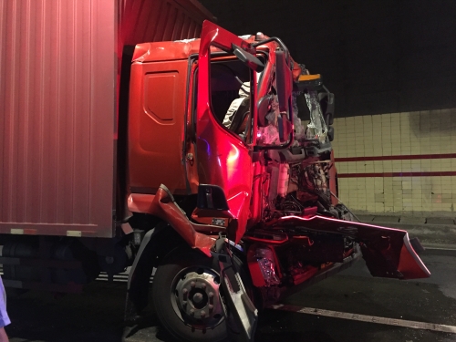 圖為事故車輛 接警后,執勤隊員立即奔赴現場,做好車輛預警工作?,F場兩輛廂式貨車停在慢車道上,后貨車的副駕駛室被擠壓得嚴重變形,幸好副駕駛位置無人,否則后果不堪設想。受傷的司機坐在電纜溝上,右手臂一直流血,意識清醒。見司機受傷,隊長通知中控員撥打救護車。前車已經停在電纜溝上,但是車輛不能移動,隊員們向司機詢問之后才了解,前車漏機油,兩車都需要拖車。隊員們一邊在隧道內疏通交通一邊在等候救護車和拖車,16:26分,救護車到達現場將受傷司機帶走,17:50分,拖車將兩輛事故貨車拖離,現場恢復通車。該起事故造成隧道內車輛緩行兩個小時,期間封道十多分鐘,事故原因是前車有故障緩慢行駛,因無任何警示標志,后車沒有注意而造成追尾。 在此提醒各位司機朋友,由于隧道內外亮度不同,進入隧道請提前開燈減速慢行,在行車過程中要注意前面路況,發現有問題及時減速慢行,并保持安全車距。如遇突發狀況,車子無法正常行駛時,為了自已和他人的安全,請及時報警并做好相應警示標志,防止二次事故的發生。 陳旦平