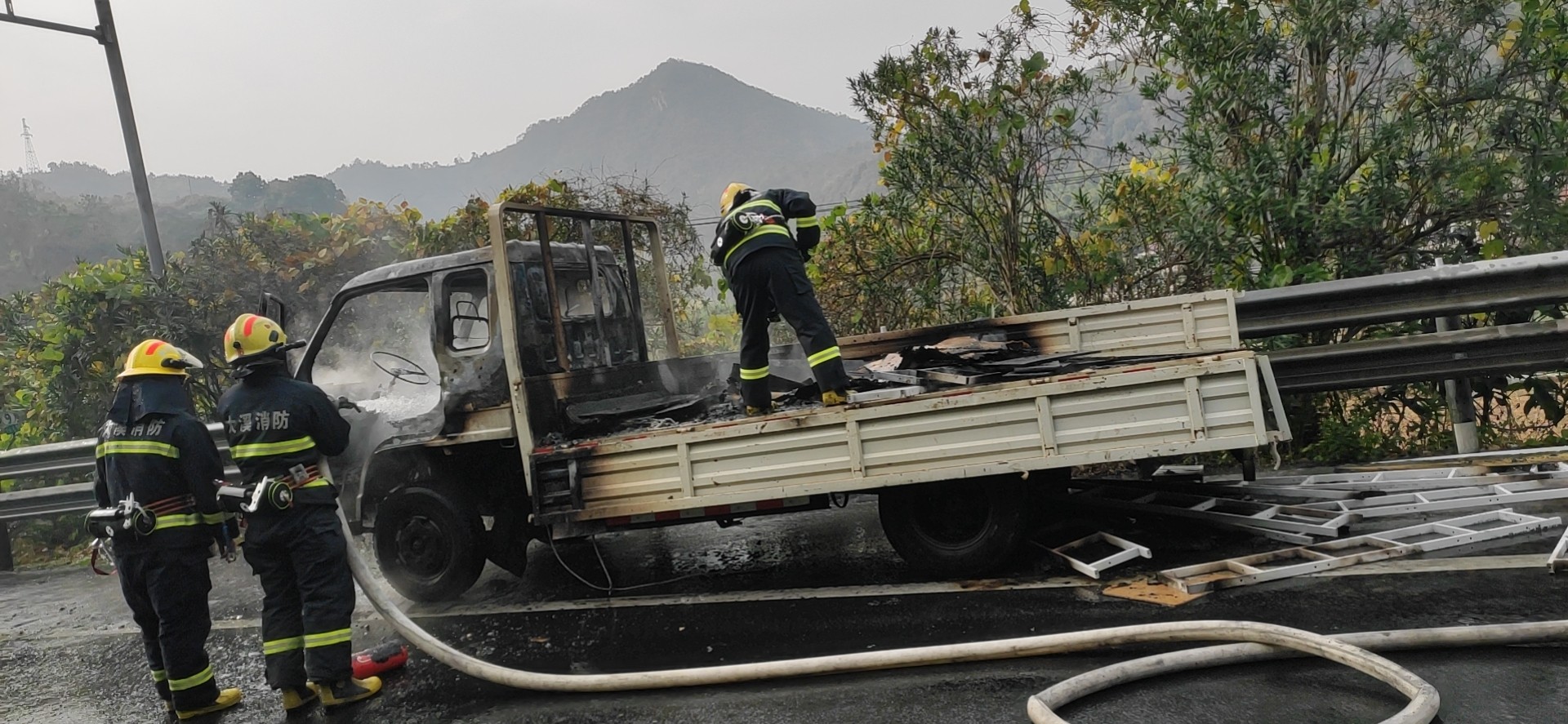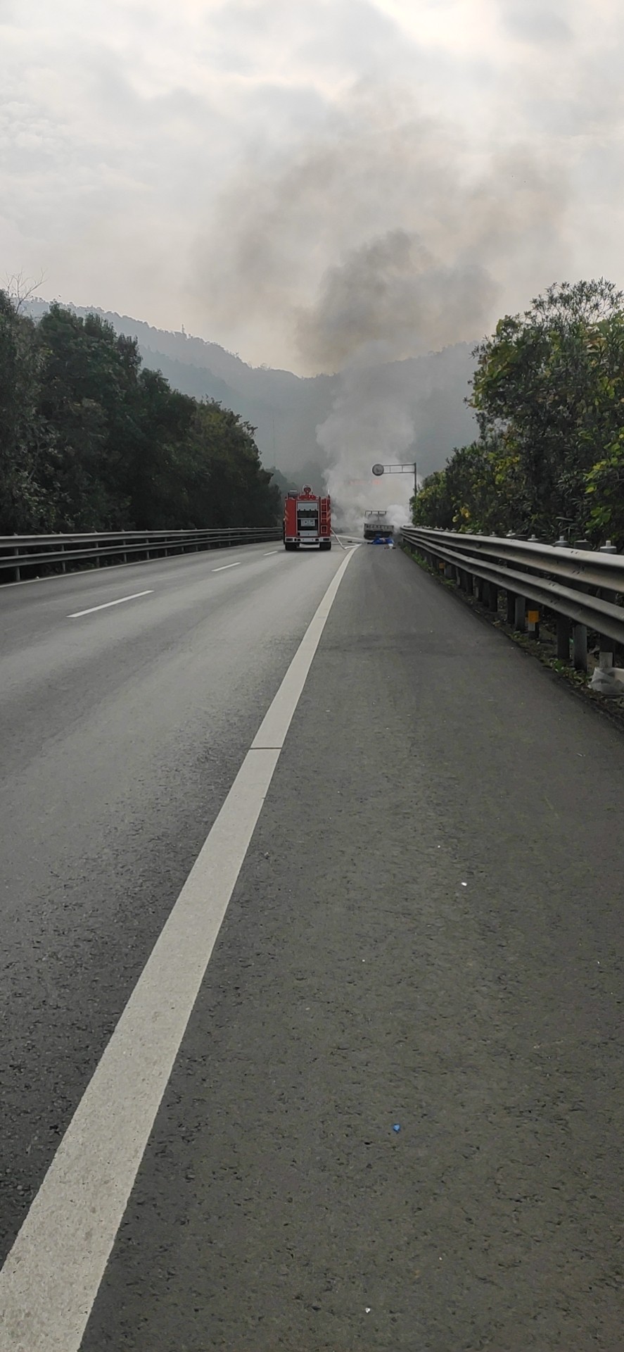 12月13日12:48中控發現溫向隧道入洞口600米處的情報板下濃煙滾滾,中控切換火災圖像至監控中心。并啟動火災報警系統,按下火災按鈕,由于著火點距離隧道北廣場最近的消火栓有500百米,隊員們出警時從倉庫里取出數只滅火器,由于車輛未實施封道,車輛一直在事故車旁邊呼嘯而過,給現場救援帶來難度,王宇鵬、湯寧光、陳幸帶著滅火器飛奔去滅火,巡邏車準備駛入事故車后進行封道預警。