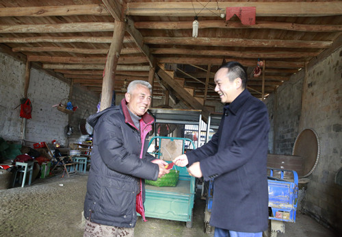 圖為圖為集團副總經理章海峰慰問困難群眾 隨后,兩位領導到每戶幫扶困難家中,給他們送去集團的慰問與新春祝福,特別是塘上村百歲抗戰老兵鮑先年,老人家雖然已經102歲,但是依然精神矍鑠,看到章海峰送上的慰問金,鮑先年還舉手敬禮,盡顯軍人風采。對此,在場所有人無不感到欣慰與高興。 此次走訪共慰問44戶困難戶。走訪過程中,受幫扶慰問的困難家庭深受感動,他們深感集團的溫暖,并表示在今后的生活中,努力克服困難,積極面對人生,不辜負集團對自己的親切關懷與幫助。 鄭蔚 張波