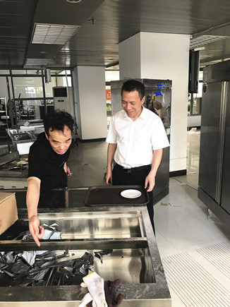 圖為公司副董事長、總經理張建平于7月1日到大樓檢查指導食堂整改工作