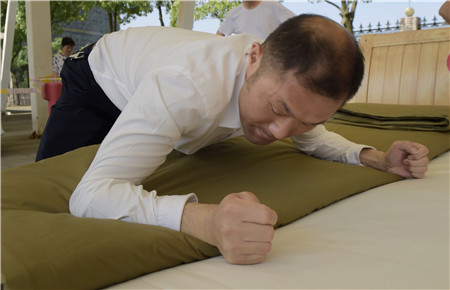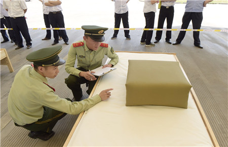教官用手量量被子上下厚度,四周細細觀察,在兩床“豆腐塊”被子之間反復來回查看了幾遍,又與另一個教官指指點點商量了好久,不僅是參賽者,圍觀者都開始緊張了。確實,按照內務整理要求,這兩床已被疊成豆腐塊的被子折得有棱有角,被面光滑,上下勻稱,外行人看來就是一模一樣的完美,沒有任何區別了?!白屗麄兌紩x級吧。”旁觀者說。教官笑著搖搖頭,對大家解釋道:“3號床勝出,因為它是雙面折法,在規定時間內兩面修整程度都一樣平整,這樣比起來,5號床稍遜一籌?!?/span>