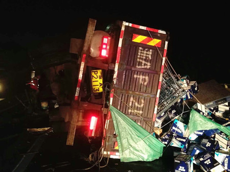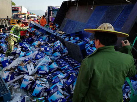 8月25日凌晨4點(diǎn),甬臺溫高速溫向1648+7路段,一輛運(yùn)啤酒的大貨車因司機(jī)疲勞駕駛,導(dǎo)致車輛撞上中央護(hù)欄而側(cè)翻,啤酒灑滿一地,后方兩輛貨車避讓不及造成多車事故。