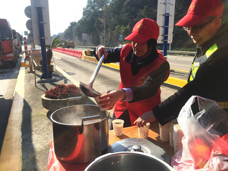 圖為工作人員在備熱飲品 當(dāng)天是入冬以來最冷的一天,收費(fèi)崗?fù)ぶ車鷼鉁剡_(dá)到零下4度。該所員工身穿耀眼的“紅馬甲”,面帶微笑,在車道安全島內(nèi)搭起臨時“便民服務(wù)臺”,頂著嚴(yán)寒為過往司乘人員遞上一杯杯滾燙的姜茶與紅豆湯,并提醒司機(jī)朋友天冷注意保暖。 “姜茶暖我身、服務(wù)心貼心啊!”一位司機(jī)師傅接過姜茶不由地詩意起來。 “你們服務(wù)態(tài)度真好,有禮貌,充滿熱情,這么冷的天,能有一杯熱水是多么幸福的事情啊!”另一位司機(jī)朋友一臉笑意地稱贊道。 他們的友好回應(yīng)讓員工們忘了寒冷,也給了大家提供更貼心服務(wù)的動力。