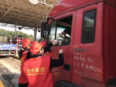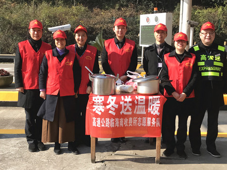 1月12日上午,臨海南收費(fèi)所的收費(fèi)員們走出崗?fù)ぃ_展了一場“寒冬送溫暖”活動。