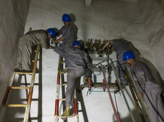 19點(diǎn)40分,高壓負(fù)荷開關(guān)到位。搶修人員安照各自的分工,掛接地電阻、拆卸舊件、重做高壓電纜接頭、安裝新跌落熔絲......就在大家以為快要完工時(shí),卻發(fā)現(xiàn)新開關(guān)的聯(lián)動(dòng)拉桿接口要略大于舊桿,任憑搶修人員如何用力都無(wú)法與底下操作桿連接,但大家并沒(méi)有放棄,而是用磨光機(jī)一點(diǎn)點(diǎn)打磨,一次次試驗(yàn),在損耗了兩張磨光片后終于將兩桿順利連接。之后,大家再一鼓作氣,將調(diào)試好的負(fù)荷開關(guān)固定在離地面3米之高的墻上,并成功連接電纜。