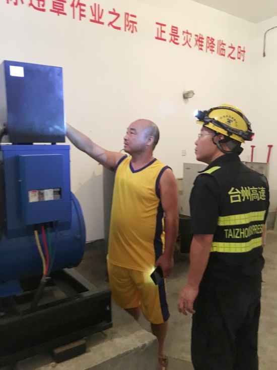 圖為搶修人員查看發電機運行態況 然而僅僅過了5個小時,28日凌晨2點20分,臨海南收費所的一通搶修電話將隊員們驚醒,臨海南收費所又斷電了! 凌晨的臨海南收費所籠罩在黑暗中,微風輕輕地吹著,除了蟋蟀的鳴叫,唯有搶修人員的手電偶爾劃破夜空。搶修隊員們很快就發現了故障原因,這次是市電B相沒電,因為是凌晨,考慮到電力部門外線人員不會來修復,搶修人員決定暫時采用備用發電機發電的方式,待天亮后再聯系供電部門。為了防止臨海南收費所再次陷入斷電困境,維養中心搶修一班班長何小敏從30公里外的張家渡連夜驅車趕到了所里,主動請纓留下來值守,待電力部門恢復正常市電后再回去。