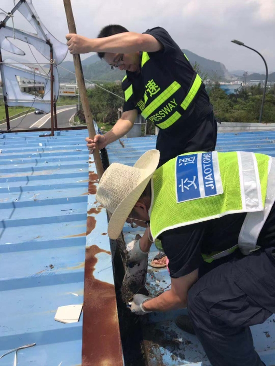 圖為工作人員清除收費頂棚垃圾 及時下降各收費所互通區高桿燈。為提升互通區照明亮度,減少因選錯路口而帶來的不必要的麻煩,集團在各收費站出入口互通區共安裝了11盞40米高度高桿燈,每盞高桿燈上方有12盞鈉燈。倘若這些高桿燈上鈉燈在臺風襲擊下一旦掉落后果將不勘設想。8月8日,中心再次召集各班人員對收費沿線高桿燈進行了下降處理。因高桿燈四周雜草叢生,在下降時維修隊員不僅要忍受底下蚊蟲肆意叮咬,還要克服時而烈日時而大雨的怪異天氣,沒放幾盞隊員便濕透了全身,衣服是濕了又干,干了再濕。