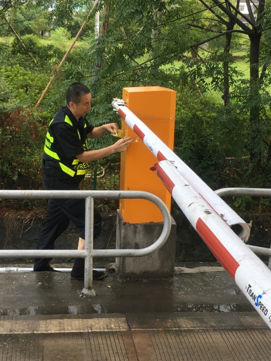 圖為工作人員下降各收費所互通區高桿燈 增強機電設備防水措施。集團收費站有很多機電設備直接安裝在戶外,因外層有開關柜保護,一般雨水是無法滲透的。可一旦遇上臺風雨等惡劣天氣就很難確保內部設備不會被打濕,尤其是計量柜里面的計重設備,一旦短路損壞會立即造成車輛擁堵。因此,剛完成高桿燈下降工作的中心隊員顧不上休息,又馬不停蹄趕赴收費所將計量柜、欄桿機等重要設備用封帶紙進行密封處理,不漏過任何一處可能進水的地方,大大增強了這些設備防水性能。