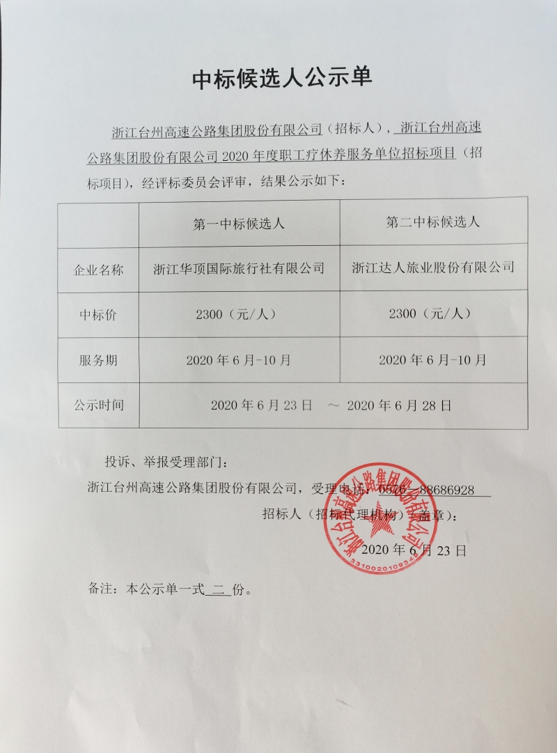 2020年度職工療休養(yǎng)服務(wù)單位招標項目中標候選人公示單