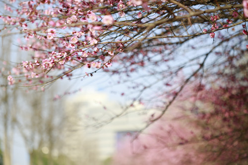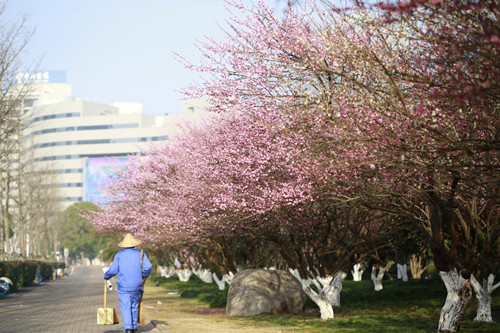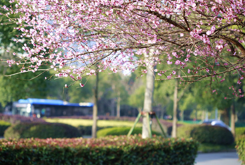 最后一站,便是市民廣場(chǎng),我見(jiàn)過(guò)的最美公交站臺(tái)。初春的清晨啊,一下車便有沁香拂散,迎接我下車的那是大片繁花盛開呀,路邊草地一溜的紅梅、白梅,在藍(lán)天下絢爛地肆無(wú)忌憚地綻放。呵,是的,還有藍(lán)天,最近流行的一個(gè)詞叫“臺(tái)州藍(lán)”,忽然想起來(lái),每日公交車上下班,低碳出行,這算是我為“臺(tái)州藍(lán)”添了一筆淡藍(lán)嗎?應(yīng)該是吧。于是,在藍(lán)天紅白花海中,慢慢穿過(guò)梅林、小橋、亭子,上班之路竟是如此心情舒緩。 鄭蔚