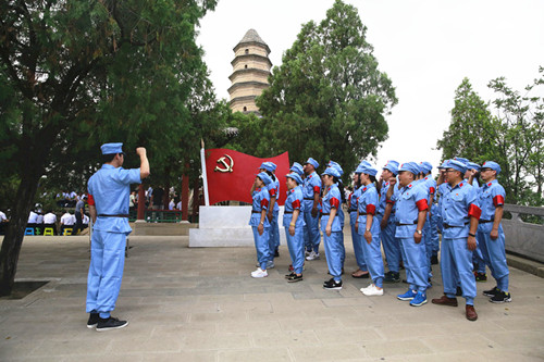 圖為黨員在梁家河合影 不顧前一天的舟車勞頓,第二天一大早,黨員們整裝出發(fā),在紅色旗幟引領(lǐng)下,頂著烈日,一路步行到達(dá)寶塔山山頂。“手抓黃土我不放,緊緊兒貼在心窩上。幾回回夢(mèng)里回延安,雙手摟定寶塔山。”綜合支部的小周對(duì)著寶塔山,情不自禁地大聲誦讀起賀敬之的《回延安》。黨員們?cè)谖∥毸赂吲e右拳,用鏗鏘有力的聲音宣讀了入黨誓詞,對(duì)于大家來(lái)說(shuō),重溫入黨誓詞是共產(chǎn)黨員表達(dá)自己為共產(chǎn)主義奮斗終生的最佳方式,黨員們的心靈再次受到震撼和洗禮。